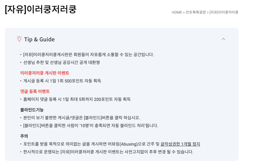 전화영어를 하고 있는 민트 회원은 당연히 알고 계실 가장 유명한 게시판이 바로 '[자유]이러쿵저러쿵' 커뮤니티 게시판 입니다. 여기는 누구나 민트영어 회원이라면 전화영어나 화상영어 수업을 하고 있던지 하고 있지 않던지 상관없이 모두가 다 회원가입만 하면 이용할수 있는 게시판으로 자유롭게 원하는 소통을 민트영어 회원들과 커뮤니케이션 할수 있는 게시판 입니다.