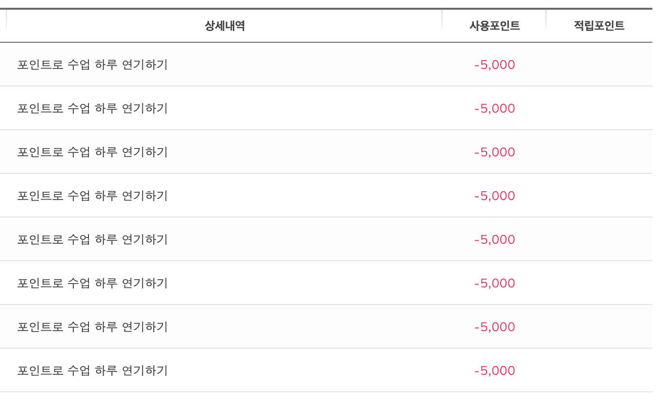 그래서 겨우 모은 포인트로 "하루 연장하기로"겨우 하나 남은 수업을 계속 연장 하는데만 쓰다가, 그렇게 생각하면 ''조금만 더 부지런 했다면.....'' 수업을 하나씩 연장을 할 수 도 있었지만 5,000point 와 10,000point는 하늘과 땅의 차이나 마찬가지여서 하루 하루 하나남은  CLASS  를 놓치면 안되는 급박한 상황에서는 정말 어쩔수 없는 선택이었어요.