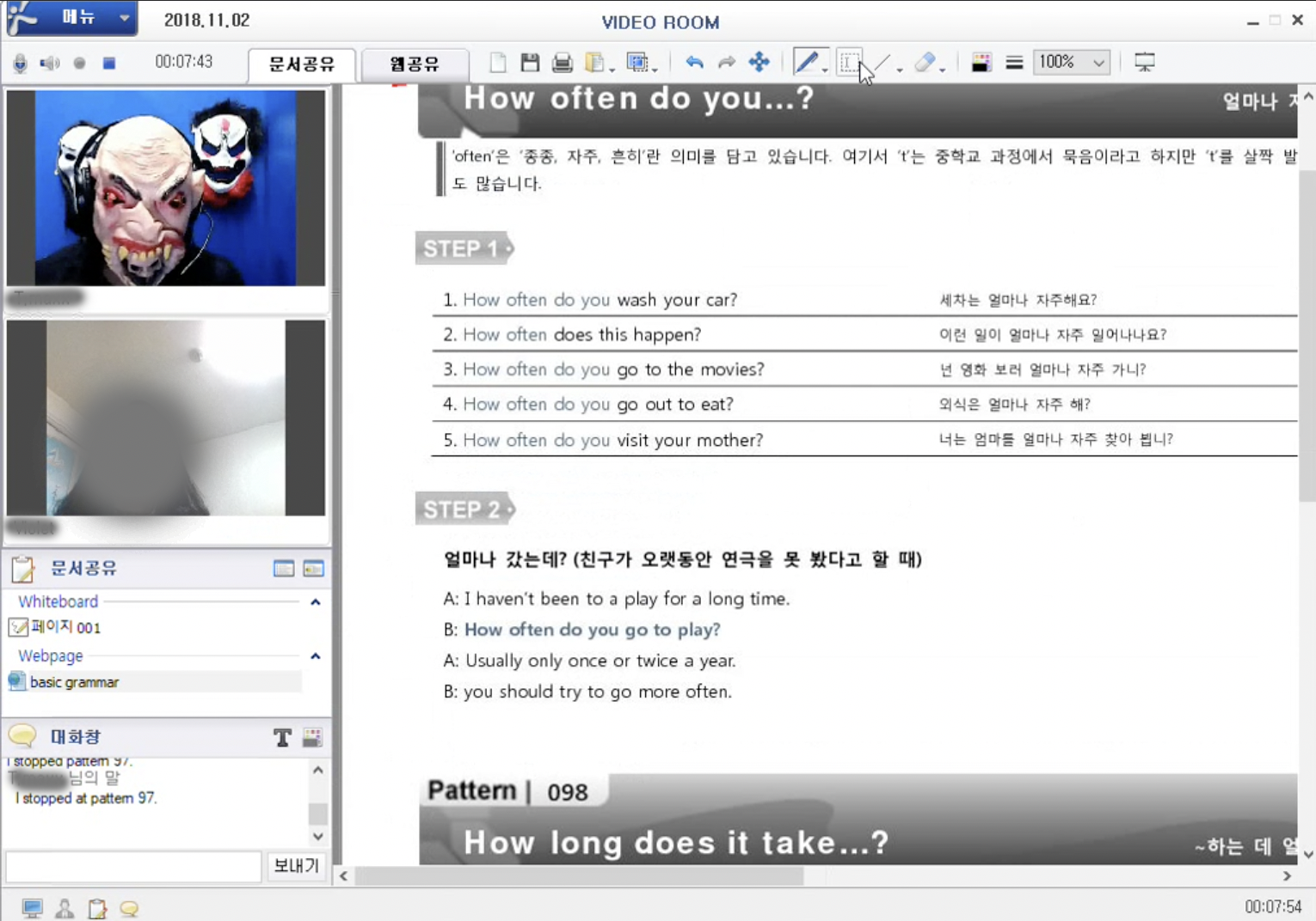 아~ 화상영어의 단 한가지 단점이 있다면 바로 내가 아침에 쌩얼이거나 잠옷 차림이어서 수업 하기 민망 스러울 때가 있죠~ 그럴때는 과감하 카메라를 끄시면 됩니다. 저희 학생들이야 선생님의 입모양을 보고 제스쳐를 봐야 하니 선생님과 화면 교재 등 설명, 채팅창 만 보고 저희 카메라는 꺼두어도 수업에는 아무 지장이 없다는 것 !!