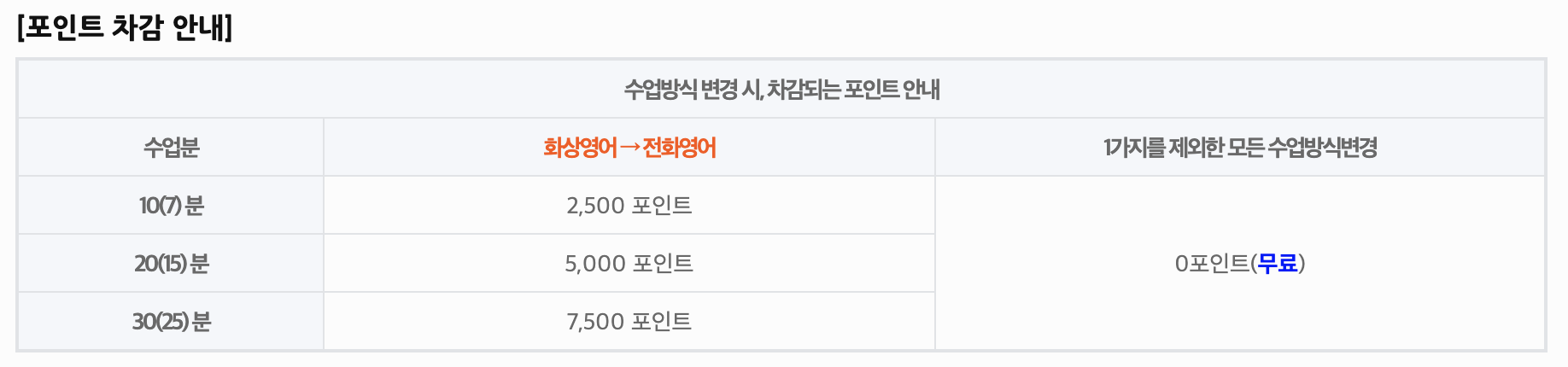 대신 유의할 점이 있는데요.전화↔화상 및 전화번호변경 서비스 안내를 꼼꼼히 읽어 보셔야 할것이 특정 날짜의 수업에 대하여 회원님이 원하는 대로 수업방식(화상영어↔전화영어) 및 전화번호를 수업시작 15분 전까지 변경할 수 있는 서비스이며, 전화번호만 변경할 경우에는 무료이지만, 경우에 따라서는 포인트가 필요할 수도 있어요. 그리고 전화영어에서 화상영어로 변경할때는 수업이간이 줄어든다는 점 참고해주세요.