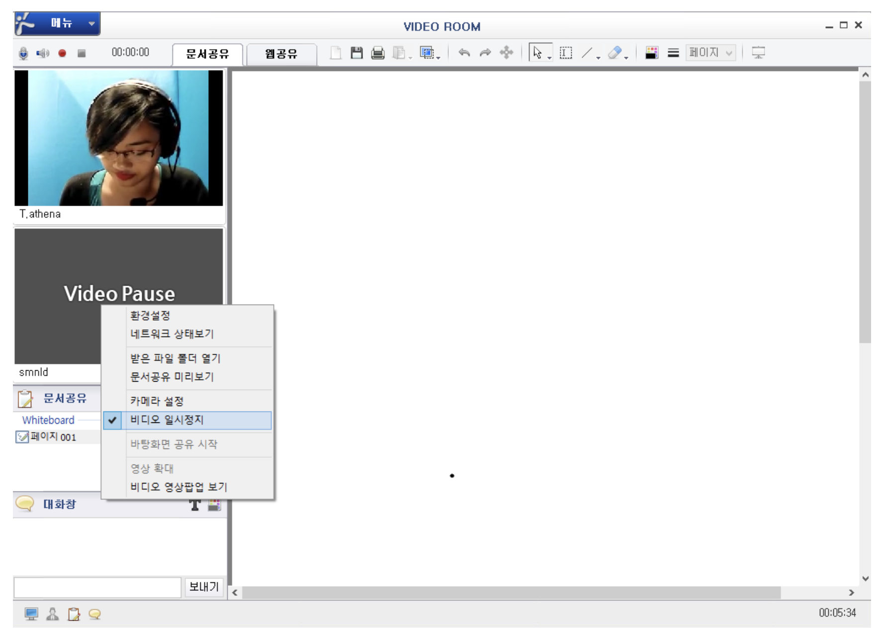 강의실 접속 전에 설정을 하실 수도 있구요. 강의실에 이미 접속을 하신 상태라면, 1. 본인의 얼굴이 노출되는 카메라 영역에서 마우스 우클릭(마우스 오른쪽 버튼 클릭)을 하고 2. 아래 그림과 같이 비디오 일시정지 메뉴를 클릭하면, 선생님이 학생의 얼굴을 보실 수 없습니다.(Video Pause 로 표시 됨)